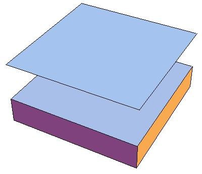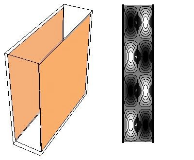 Casimir cavity: the left picture shows a cavity made by two metal plates (by two mirrors); the right picture illustrates standing electromagnetic waves in the cavity. Even if the cavity is empty, without any electromagnetric field inside, the sheer possibility that such standing waves may exist is important in the Casimir effect.