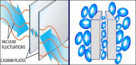 Casimireffect and vacuum fluctuations: roughly speaking, the difference in the pressure of the quantum vacuum inside and outside the cavity causes the plates to attract each other.