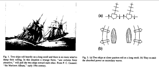 Maritime analogy of the Casimir force [5]. In calm weather and without any water currents, ripples on the sea may cause two tall ships to attract each other, with potentially catastrophic consequences. The pressure difference of the ripples between the ships and the ripples outside them causes the attractive force, similar to the Casimir force. In the Casimir effect, the ships are the cavity plates and the quantum ripples of the empty electromagnetic field play the role of the water waves.