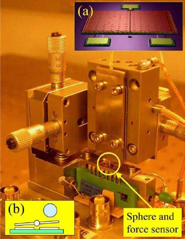 Apparatus for measuring and manipulating the Casimir force. Instead of two parallel plates, a Gold sphere and a nano-fabricated silicon swing form a cavity. The torsion of the swing measures the Casimir force. These experiments are done in the group of Federico Capasso.