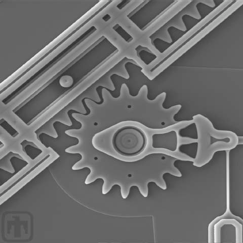 Accelerometer and electronics on one chip – the trigger chip of an airbag, for example. From Sandia’s MEMS page.
