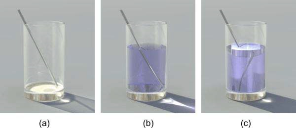 Negative refraction. (a) shows an empty glass, (b) a glass filled with an ordinary medium with positive refractive index, such as water; the straw inside the glass is refracted. (c) shows what would happen if the water is replaced by a negatively refracting medium. From the Nanophotonics group at the Karlsruhe Institute of Technology.