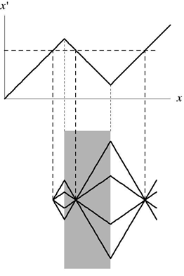 A negatively refracting medium transforms space [2,10]. The top figure shows the graph of a coordinate transformation from the real Cartesian x to x’. The medium shown in the lower picture turns out to perform this transformation. The transformation changes right-handed into left-handed coordinates and so the medium creates left-handed electromagnetism. Our picture shows why left-handed media make perfect lenses [11]: each point x in physical space corresponds to one x’, but this x’ has two more images in x, one inside the device and one outside. Since this map is perfect in principle, the electromagnetic fields at the three x points are identical; the device acts as a perfect lens. The lower picture shows that light rays are negatively refracted. Such transformations turn the attractive Casimir force in x’ space into a repulsive force in real space.