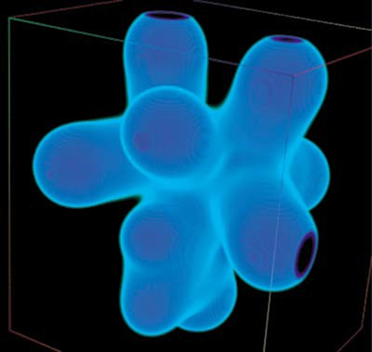In this striking image, negative charges are represented by shades of blue (the darker the denser), and the black spots show the parts of the molecule out of the computer program’s range.