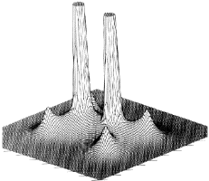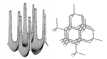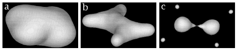 This computer-generated graphic shows how electronic charges are distributed across the surface of a molecule made of two cobalt atoms. Visualizing molecules this way helps scientists understand how different molecules merge and break apart in chemical reactions.