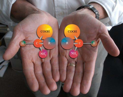 Certain things have a handedness or a specific structure of the electrons so as to divert photons to the right of left. This is the handedness of the molecule. Dextro is for right, Levulo for left. Our biology has been made so as this is very important. We need left handed amino acids and proteins and right handed sugars for cellular metabolism. We have made the full thesis on sugars and now we will address the issue of proteins. All of this is based on Quantum theory and this Biology is quantic in nature. The term „chiral” (from the Greek for „hand”) is applied to molecular systems whose asymmetry results in handedness; that is, the existence of a pair of nonsuperimposable mirror-image shapes (as illustrated by the relationship between one’s right and left hands). Lord Kelvin coined the term „chirality” in 1884, but it did not come into common usage until the 1960s. Many macroscopic examples of handed systems exist, including any object that features an inherent spiral or twist that can exhibit a left- and right- handed form: scissors, spiral staircases, screw threads, gloves, and shoes. Some mineralogical materials exhibit handedness in the solid state. In 1801 the crystallographer René-Just Haüy (1743–1822) observed that there were right- and left-handed quartz crystals, a phenomenon known as hemihedrism. The term „enantiomorphous” („in opposite shape”) was created to describe the macroscopic relationships between nonsuperimposable, mirror-image crystalline forms.