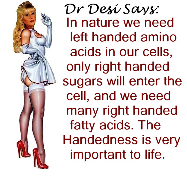 In nature we need left handed amino acids in our cells, only right handed sugars will enter the cell, and we need many right handed fatty acids. The Handedness is very important to life.